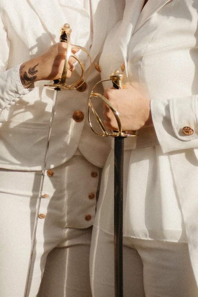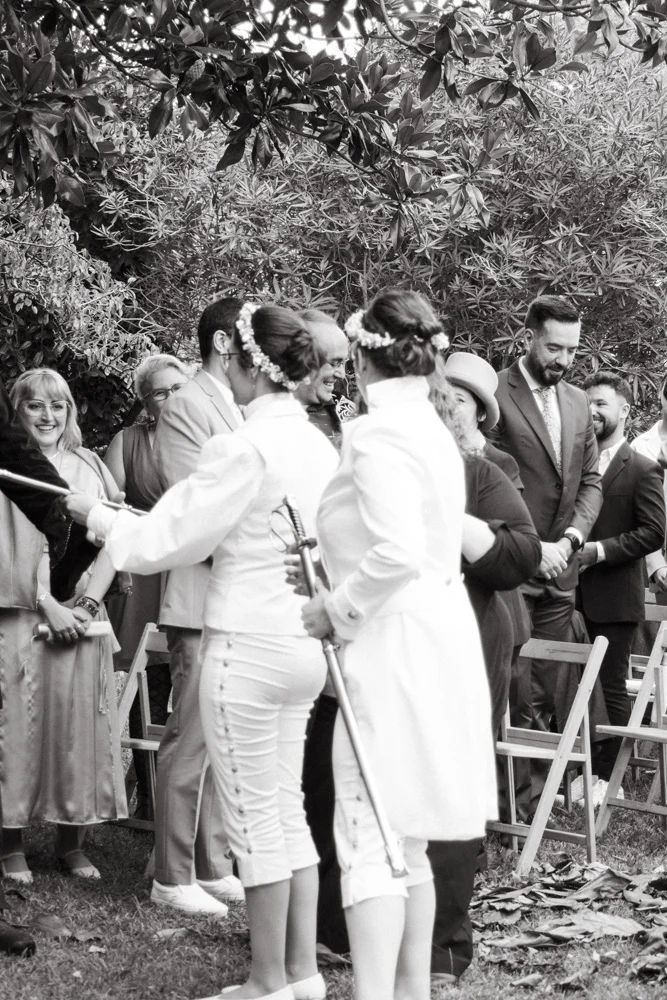 Para los votos, la parte simbólica de la ceremonia, pronunciaron unas palabras inspiradas en su juego de fantasía favorito, ¡con sables incluidos! Si sois fans de los juegos de rol, esta idea de votos puede ser muy guay para vuestra boda, ¿verdad?