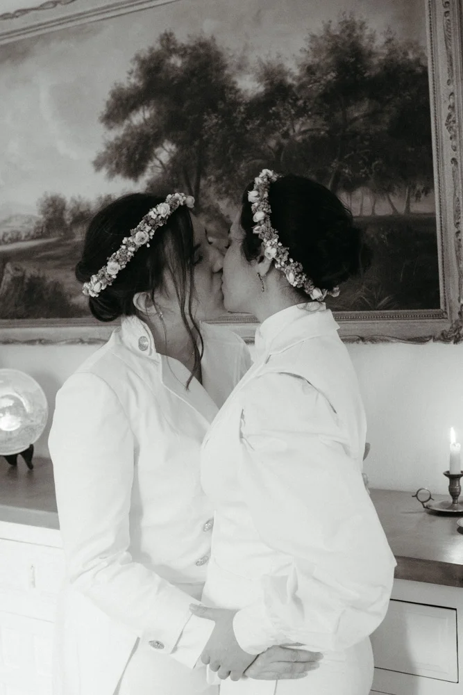 Rocío y Sara no querían nada tradicional, sino que buscaban un efecto teatral para celebrar sus dos bodas. En Lamikiz Atelier (un taller de vestidos de novia de Bilbao) les hicieron los trajes a medida a las dos. «Ni siquiera valoramos hacerlos con nadie más, porque su estilo era justo lo que buscábamos», nos cuenta Sara. A partir de los trajes, fueron añadiendo otras piezas que iban encajando poco a poco.