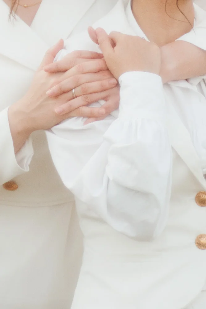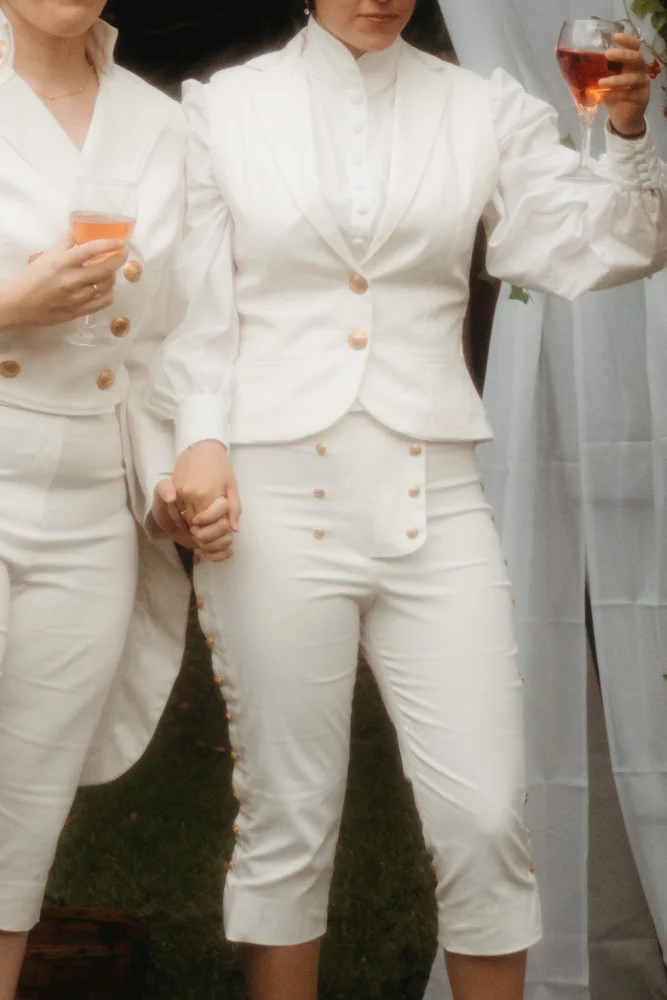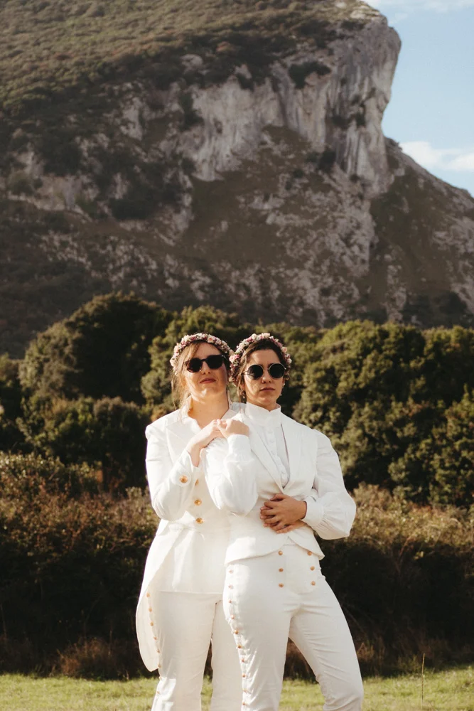 La segunda boda de Rocío y Sara fue en octubre de 2022, esta vez ya con amigos. La ceremonia se celebró en el jardín de la casa familiar de Sara. Aunque hacía muy buen día, una boda en Bilbao en octubre siempre conlleva un poco de frío, pero con los trajes de Lamizik Atelier fueron perfectas y las dos piezas fueron una ventaja maravillosa.