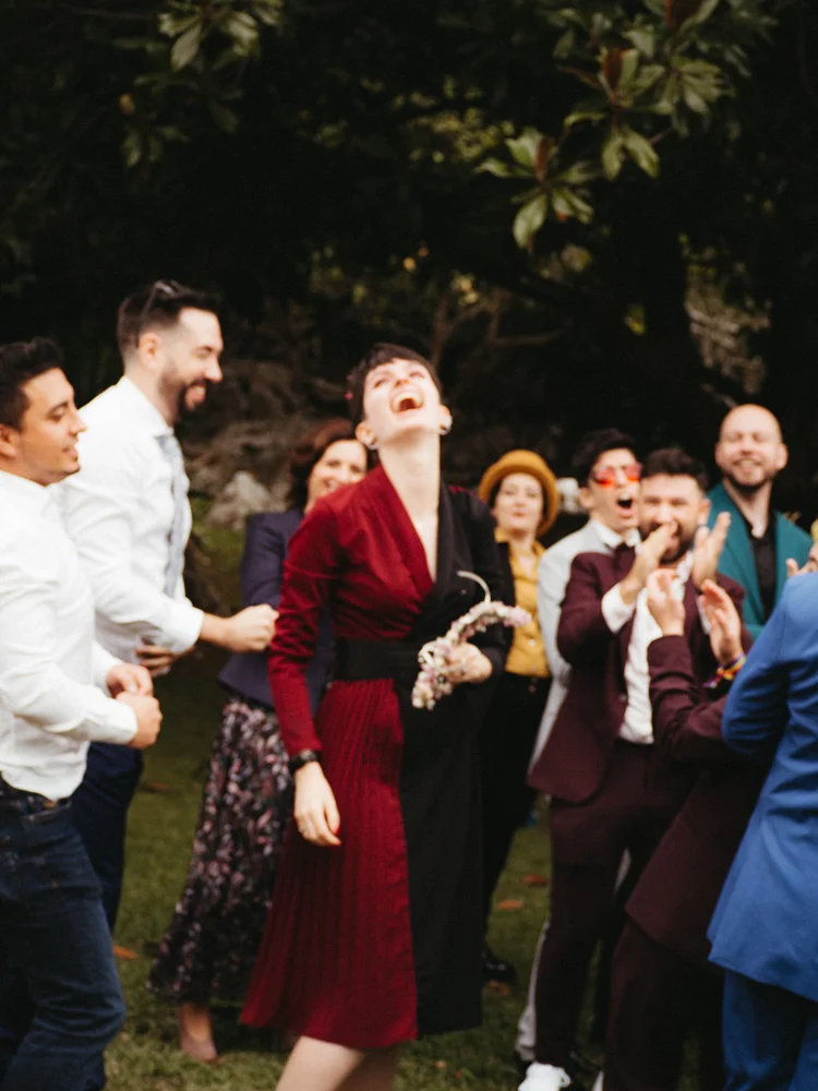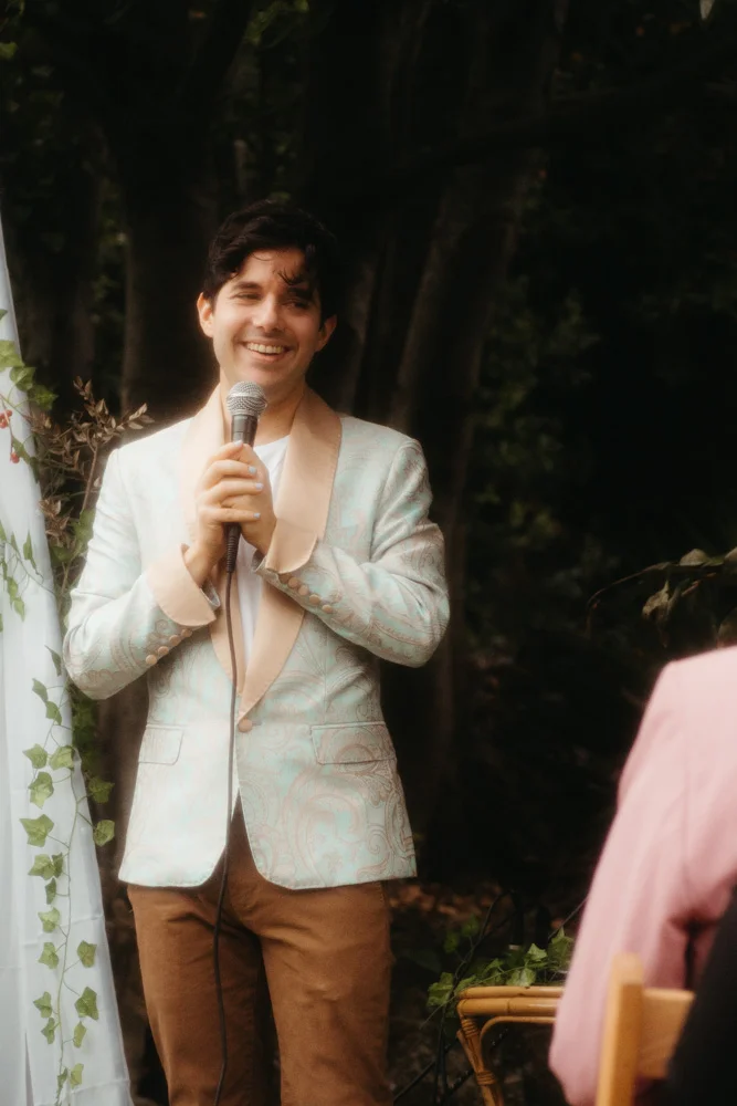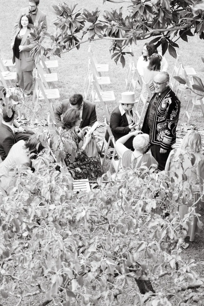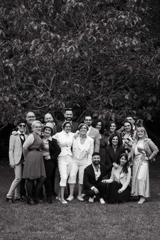 Sobre todo por la pandemia, Sara y Rocío llevaban años sin ver a algunos de sus amigos más importantes y verlos allí a todos les emocionó muchísimo. Los looks de los invitados también se alejaron de lo tradicional, ya que las novias les dieron carta blanca (dentro de lo formal) y muchos de ellos apostaron por lo original: trajes y vestidos de todos los colores, peinados de toda clase, maquillajes increíbles y accesorios singulares. «Tuvimos que contenernos para no abalanzarnos a saludarles hasta que terminó la ceremonia».