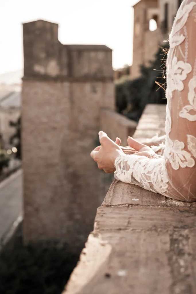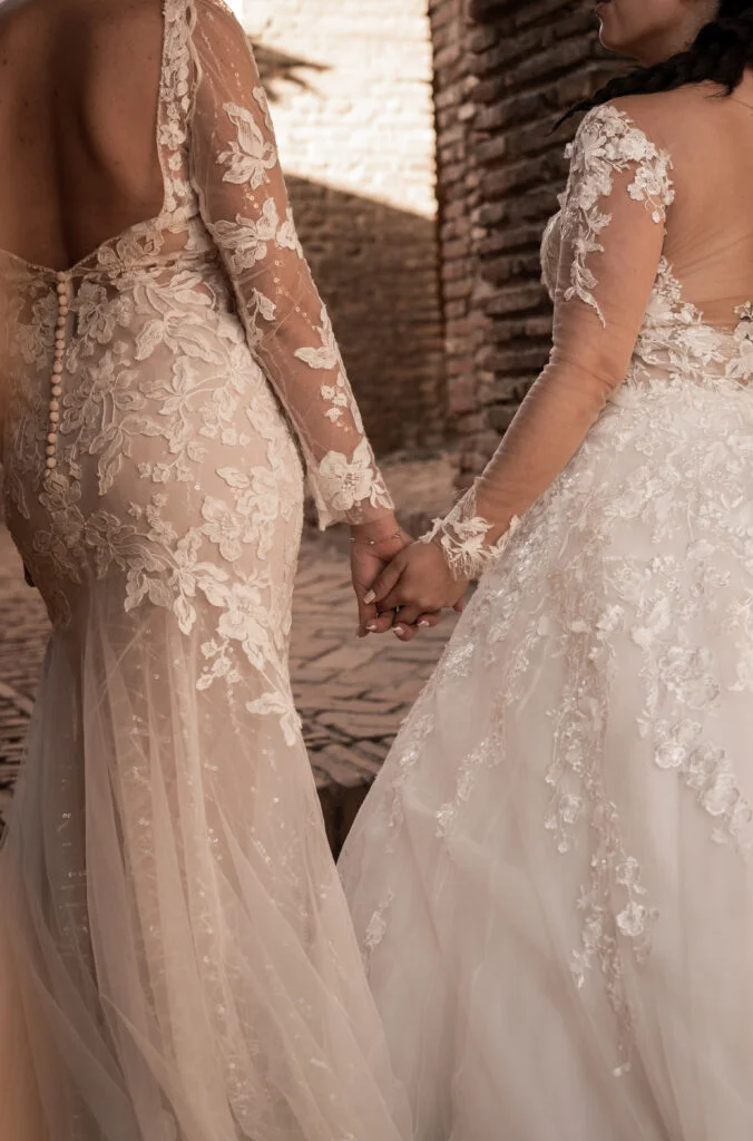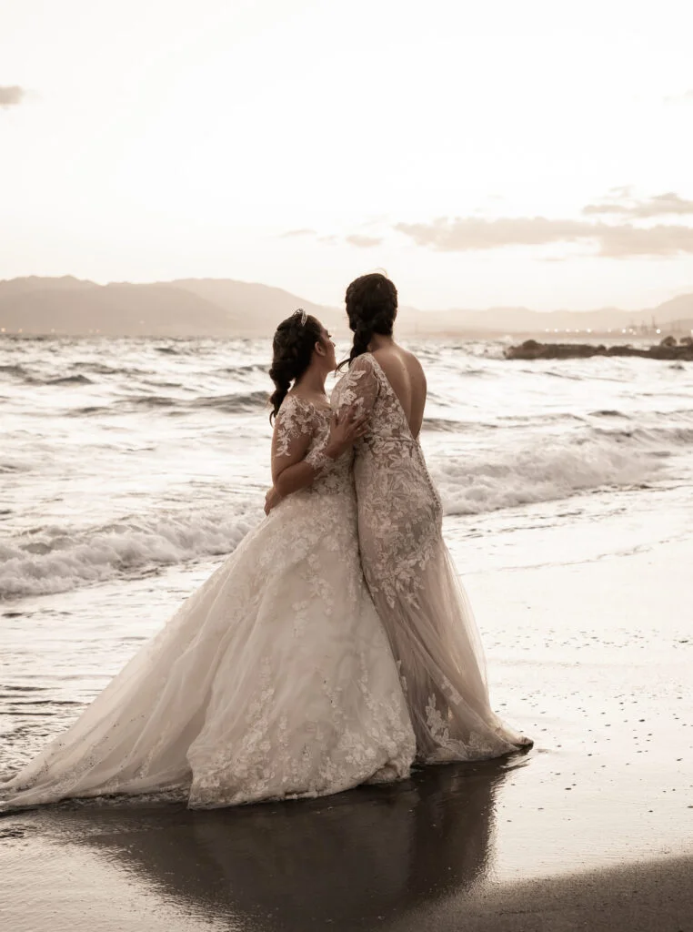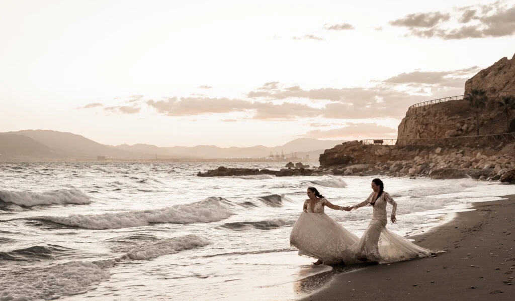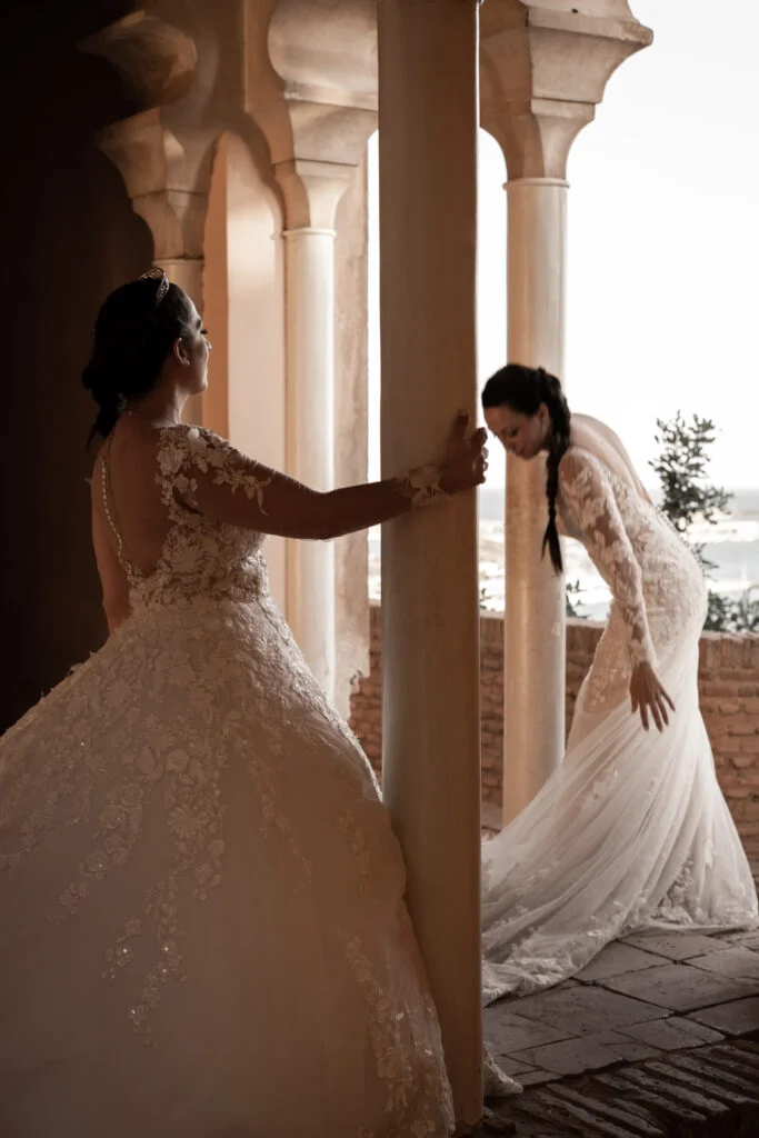 Ari es de Málaga y Conchi es sevillana. Tanto la preboda como la boda se hicieron en Sevilla, pero la pareja quería hacer algo especial en ambas ciudades. Así, decidieron inmortalizar también los orígenes y la tierra de Ari, Málaga, donde ahora viven juntas. Esta sesión postboda de Málaga tuvo dos escenarios principales: primero, estuvieron en la ciudad, en La Alcazaba, concretamente; después de recorrerla, fueron a la Playa del Parque Forestal Urbano Peñón del Cuervo.