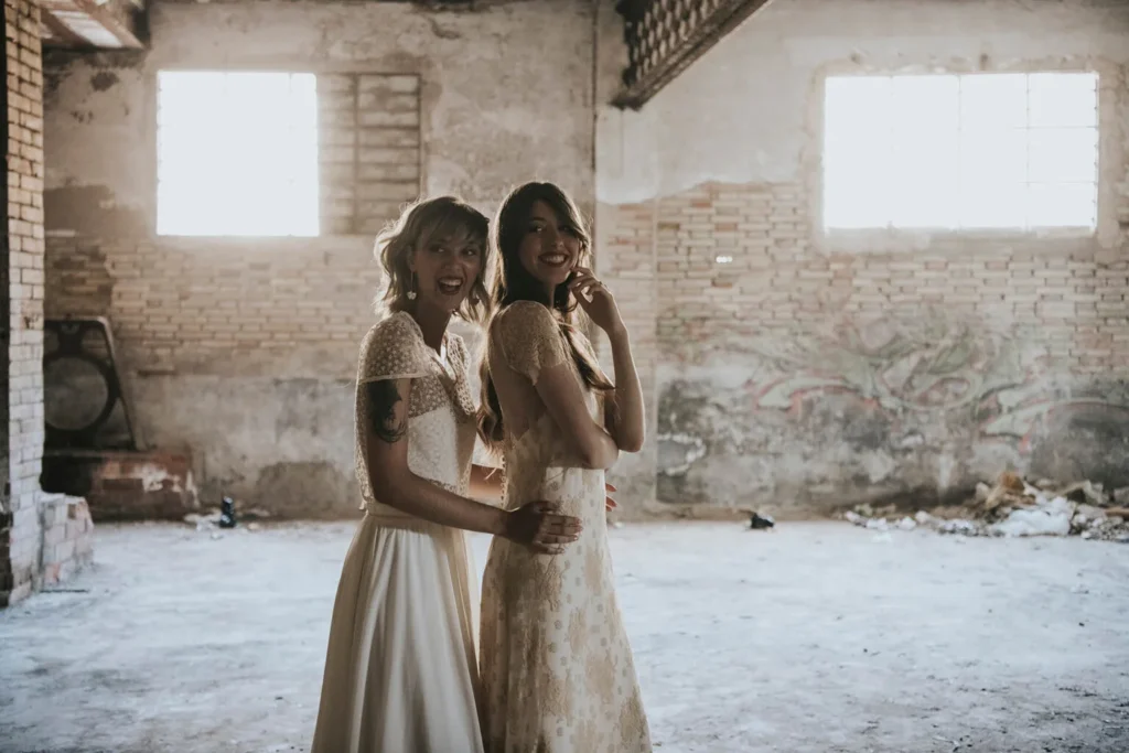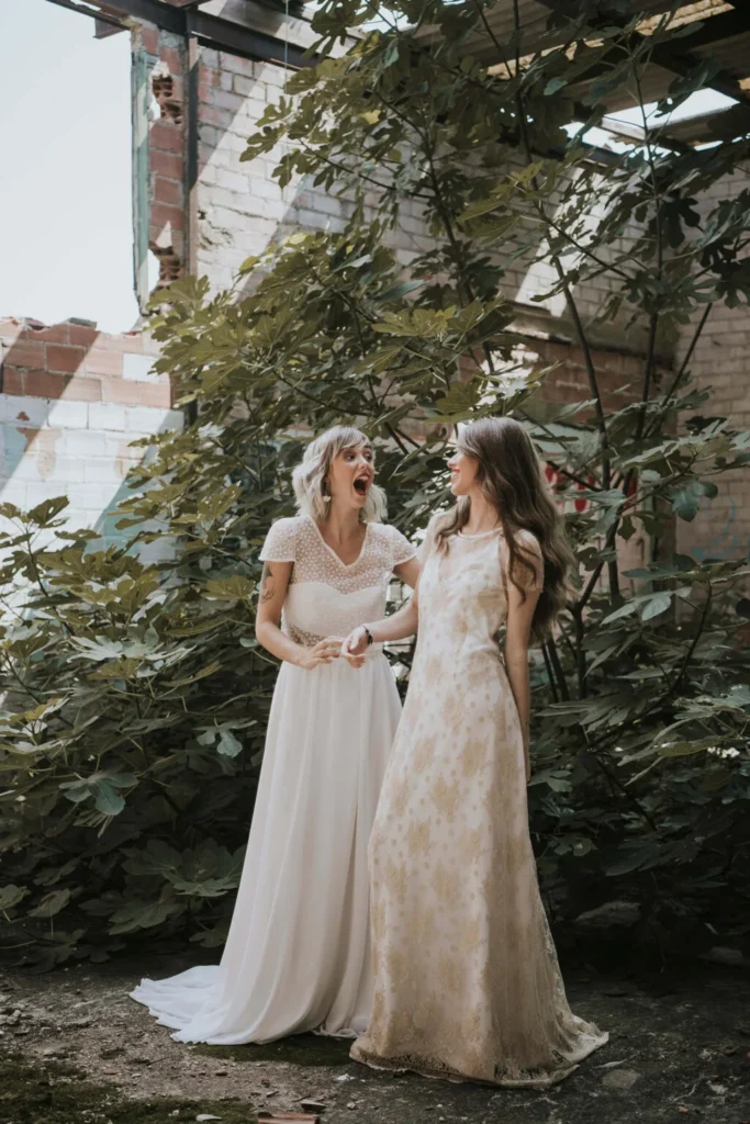 Si estás buscando vestidos de novia respetuosos con el medioambiente, vestidos de novia originales, éticos y sostenibles, esta es la mejor opción para ti. Y si sois una pareja LGTB que está buscando fotógrafo o fotógrafa de bodas, todas estas fotos son de Harold Abellan, que forma parte de nuestros proveedores destacados. ¡Son increíbles!